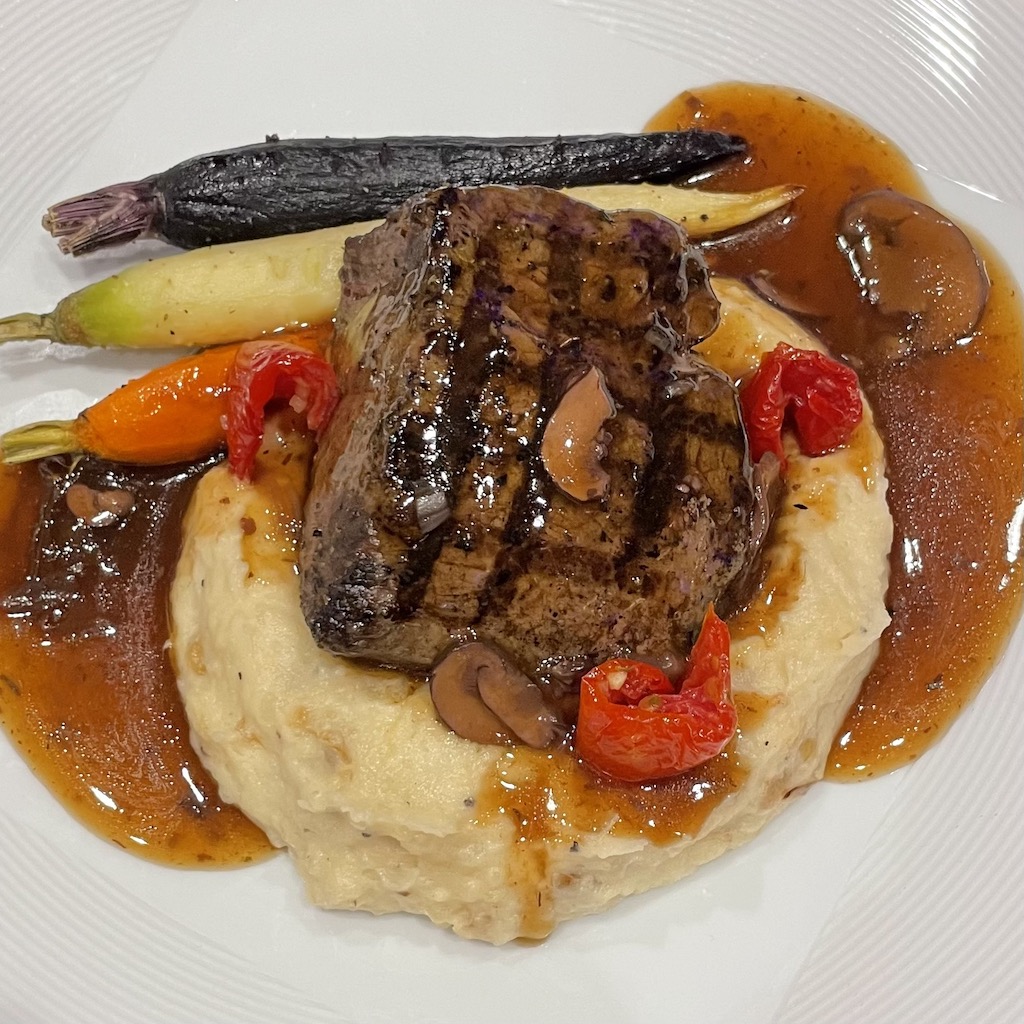 Beef: Braised Beef Short Rib Caramelized Sweet Onion Mashed Potatoes, Roasted Rainbow Carrots, and Natural Braised Jus