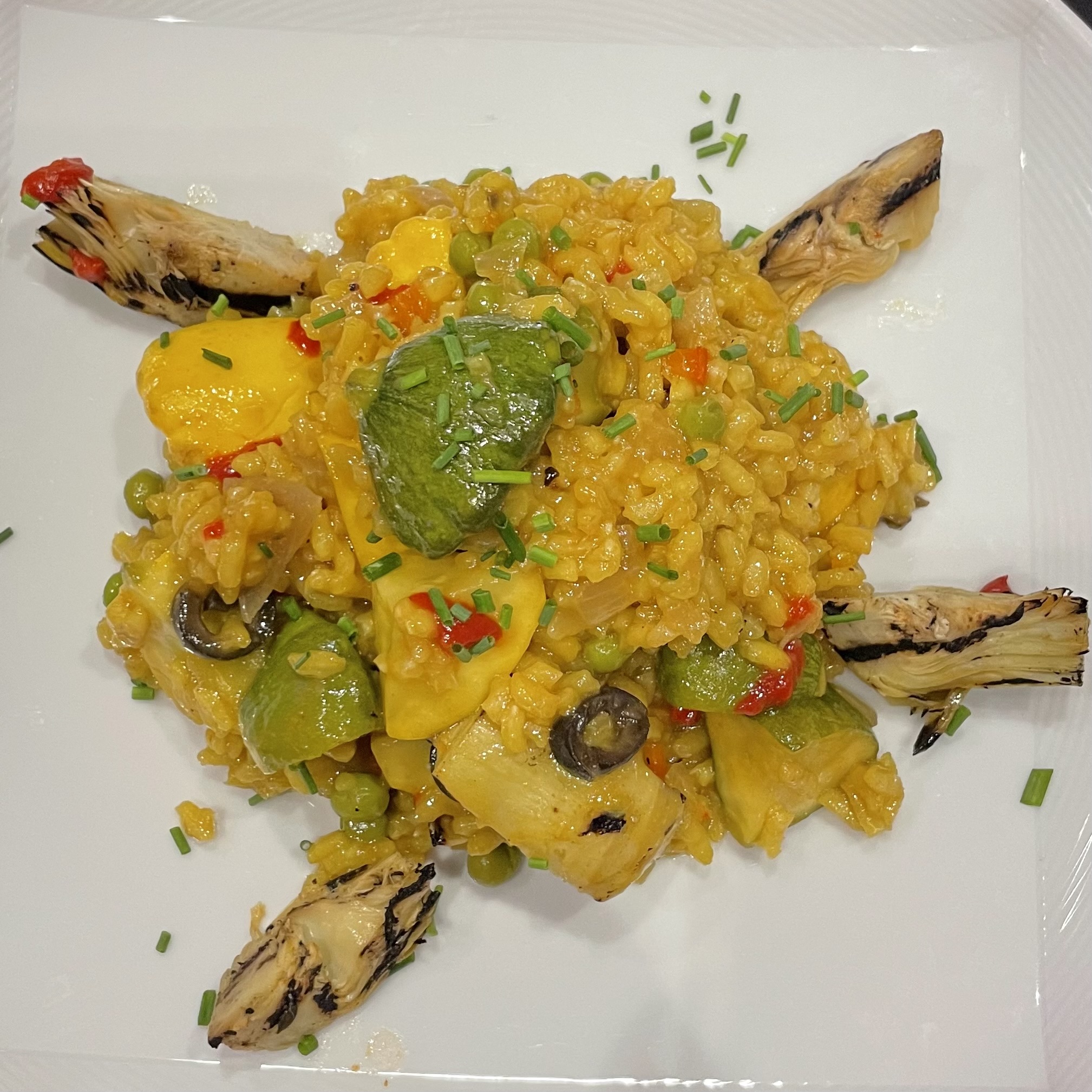 Vegetarian: Baby Patty Pan & Zucchini Paella Artichoke, Kalamata Olives, and Relish