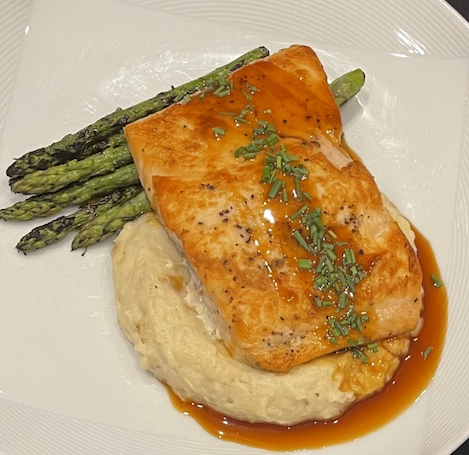 Fish: Herb Roasted Pacific Salmon, Caramelized Sweet Onion Mashed Potatoes, Thyme Grilled Asparagus, Grapefruit Butter Sauce
