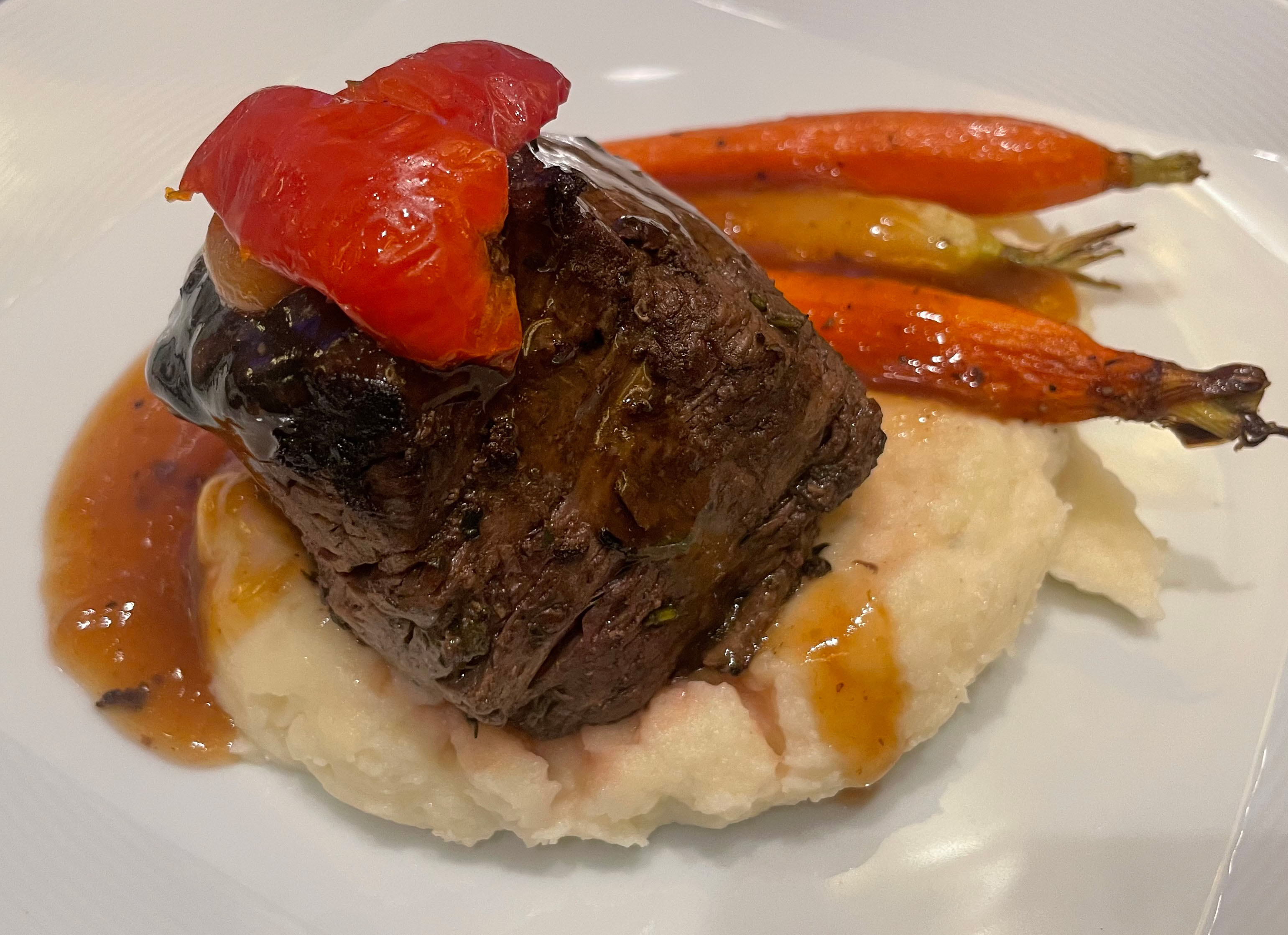Black Garlic Filet Mignon with Brandy Glazed Sauce, Rosemary Mashed Potatoes and Roasted Field Carrots