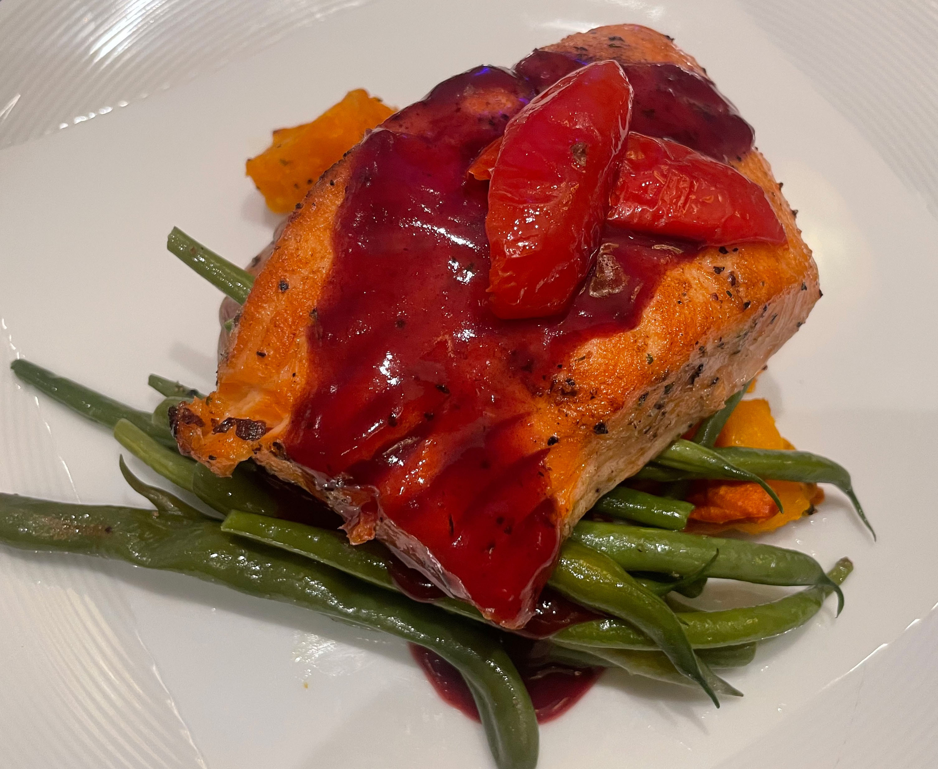 Seared Salmon with Blackberry Lavender Sauce, Wild Rice and French Green Beans