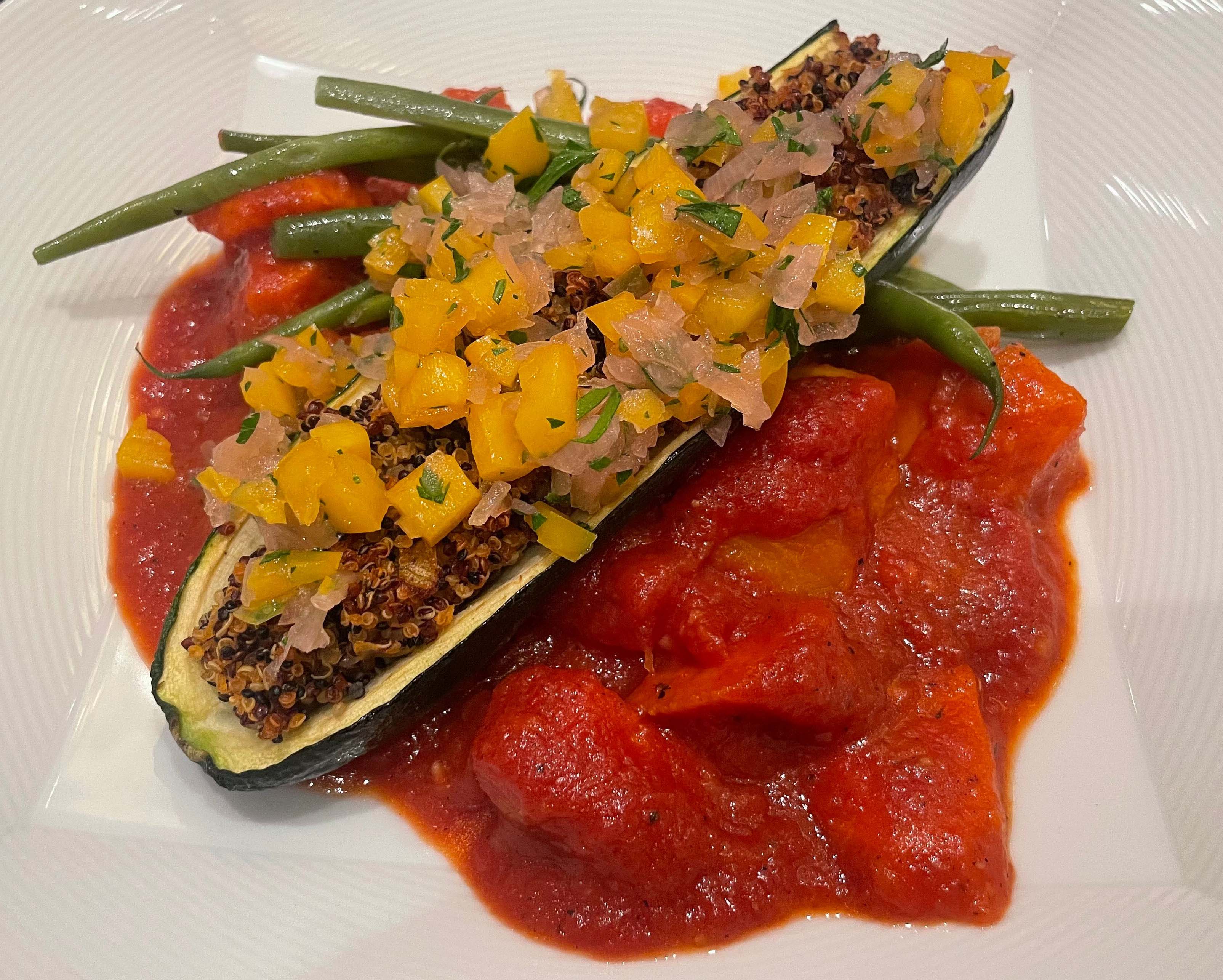 Zucchini Stuffed Mixed Quinoa, Winter Vegetable Ragout with Sweet Pickled Onions, Yellow Pepper Relish and French Green Beans